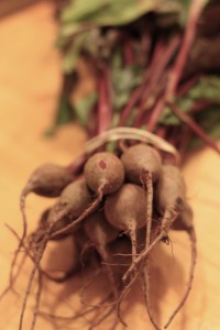 So I wound up with a few bunches of spicy greens and a bunch of baby beets, which is a funny thing; I never ate beets—I actually loathed them, in the way fifty percent of the population loathes cilantro—until one afternoon a few years ago, when I saw them in my local (good quality) supermarket. Just like that, I stood there, staring them down, thinking how gorgeous they were and how lush the greens were and suddenly, my mouth started to water. Right then and there, I called Susan from my cell phone and told her to expect a surprise for dinner; she loves beets and it was a point of contention between us that I couldn’t be in the same room with them much less cook them.