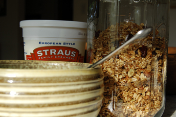 I began making my own granola a few years ago after receiving a wonderful cookbook written by the Metropolitan Bakery people in Philadelphia accompanied by a bag of their own granola. For me, theirs was delicious, but perhaps a tad too sweet and in need of added complexity. Through trial and error I improvised and fussed until the rhythm of my own recipe began to take shape. Essentially I load up on an assortment of nuts and seeds, always reserving the right to wing it depending on what I have on hand. Now, every few weeks or so a big jar of granola is born and guaranteed to last many a hearty half a day.